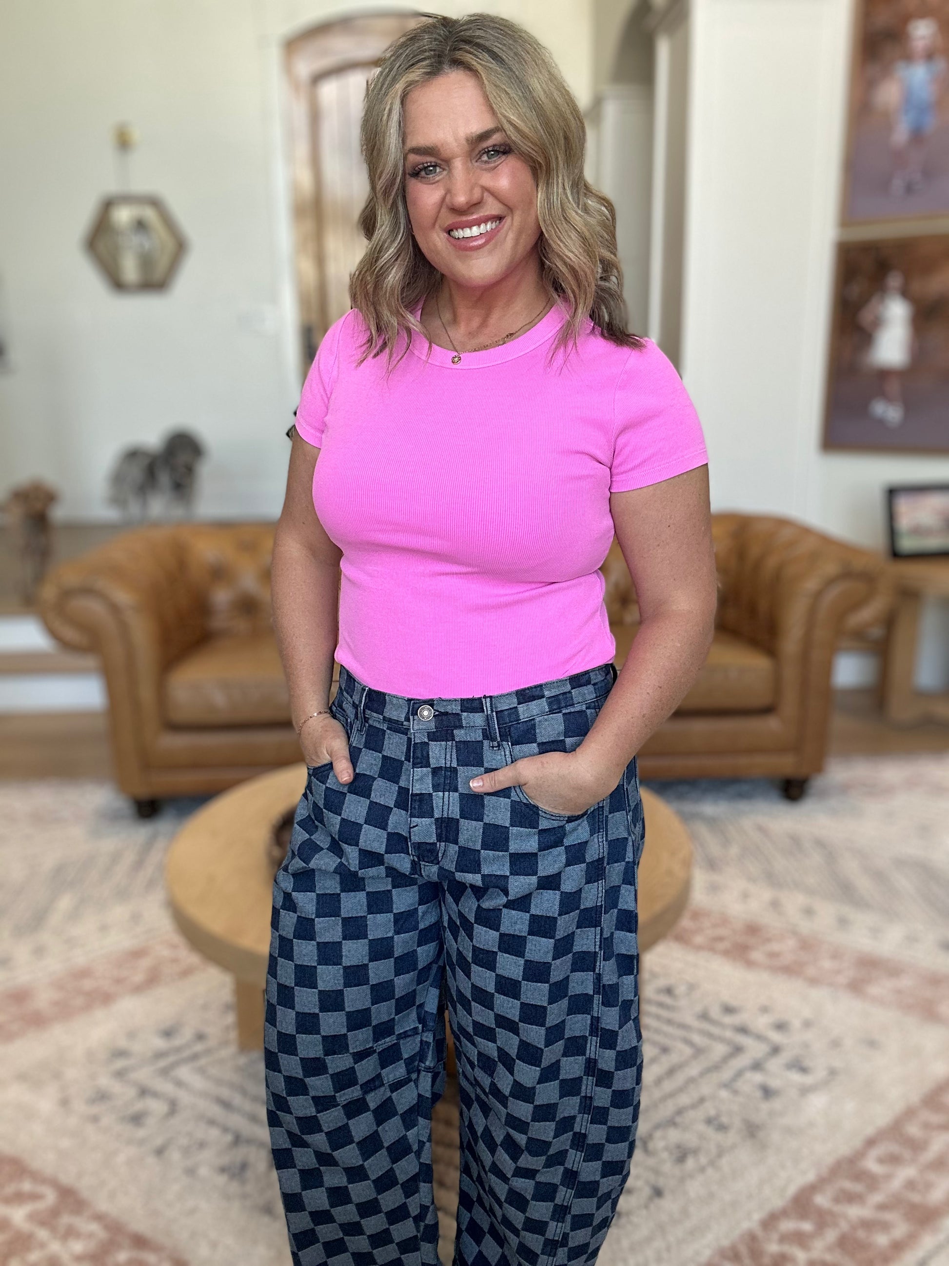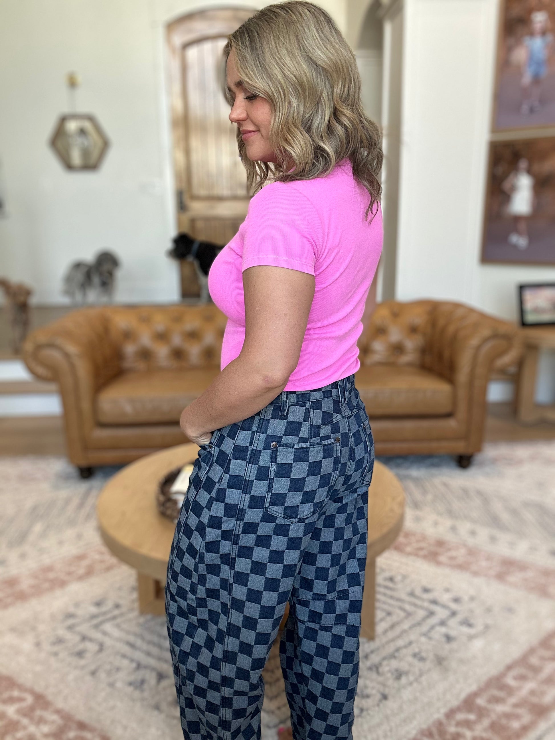 Barrel Style Leg Checkered Print Jeans are a trendy and edgy choice for making a fashion statement. The barrel style leg offers a unique and modern silhouette, adding a touch of personality to the jeans. The checkered print adds a bold and eye-catching element to the design, perfect for those looking to stand out. These jeans can be paired with a simple top and sneakers for a casual yet stylish look, or dressed up with heels and a blouse for a more elevated ensemble. Embrace your individual style with these fashion-forward checkered print jeans.